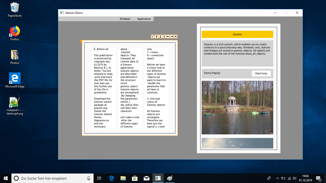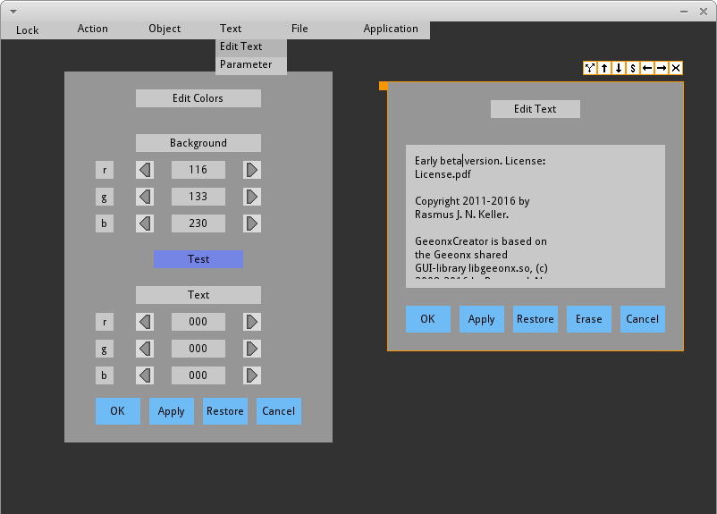 Geeonx is a crossplatform GUI-library for C programming language. You write one C sourcecode and compile it on Windows and Linux. With the tool GeeonxCreator you design one interface for the two main operating systems. Geeonx releases the developer from all redrawing tasks. Geeonx draws and updates all GUI-elements like windows, pulldown-menus, icons, inputforms and buttons of your application that you have created before with the tool GeeonxCreator. With the tool GeeonxCreator you are able to design all GUI-elements of your application. Geeonx stores the data of each and every GUI element in a corresponding Geeonx object. GeeonxCreator stores the GUI data into a *.gee and *.gew file. The Geeonx shared library will take over all drawings of GUI elements inclusive window content. The library will also handle all window, button or input events. For example with Geeonx your are able to create forms for the input of text by the user. Hence it is very easy to program applications with windows, buttons and icons. For example to alter the content of a window you just change the text_string linked with the structure of the Geeonx_object. With the call of the function gee_draw_all_objects() the whole interface of the application will be updated. The Geeonx library is written in C programming language and offers an API for the use with C/C++. You can create GUI applications for Linux and Windows with an identical sourcecode. Use the source code of Geeonx demo application geeonx_demo.c as base frame for your own application. |